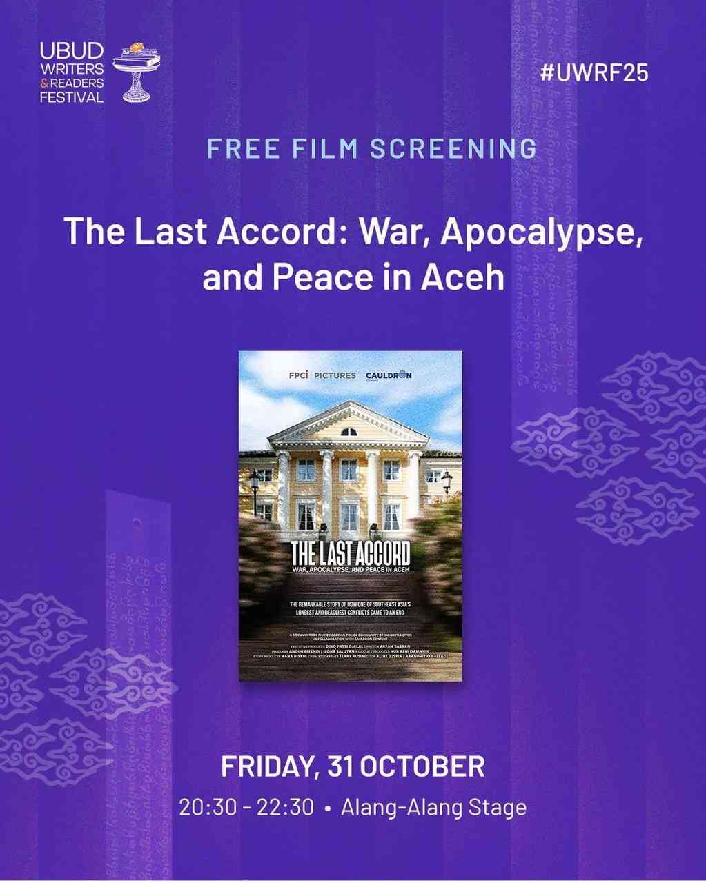 Edisi kali ini membawa sebuah sajian yang tak kalah istimewa. Pada Jumat malam, 31 Oktober 2025, program film festival mempersembahkan "The Last Accord: War, Apocalypse, and Peace in Aceh". Film dokumenter berdurasi 75 menit ini merupakan karya dari Arfan Sabran, seorang sineas muda berbakat asal Makassar. Arfan, yang sebelumnya dikenal sebagai dosen Biologi di Universitas Hasanuddin, memilih untuk meninggalkan dunia akademis dan merantau ke Jakarta demi mengejar mimpinya sebagai sutradara. Pertemuan kami di Ubud menjadi momen yang sangat berarti, mempertemukan dua individu dengan semangat yang sama dalam dunia perfilman.