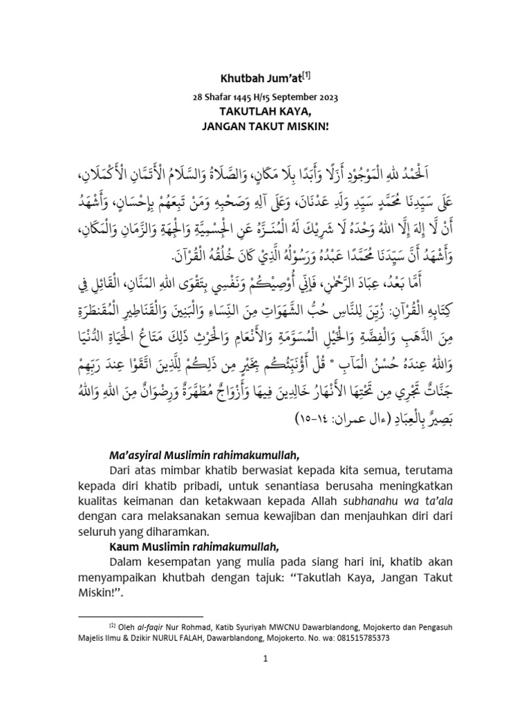 Dalam kesempatan yang mulia pada siang hari ini, khatib akan menyampaikan khutbah dengan tema: “Takutlah Kaya, Jangan Takut Miskin”.