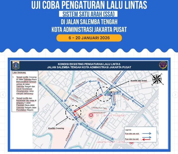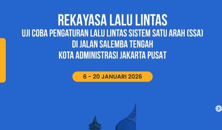 Mulai hari ini 6 sampai 20 Januari 2026 diterapkan uji coba sistem satu arah di Jalan Salemba Tengah, alternatif rutenya begini